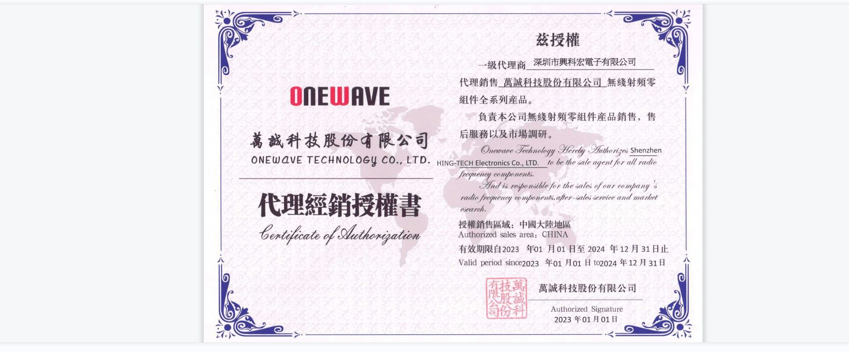 •       深圳市兴科宏电子有限公司致力于国内外知名电子元器件的代理和销售,本公司为台湾万诚品牌(ONEWAVE)一级代理商,销售万诚(ONEWAVE)无线射频产品天线(Antenna),广泛用于TWS蓝牙耳机、物联网、网通、IPCAM等行业。